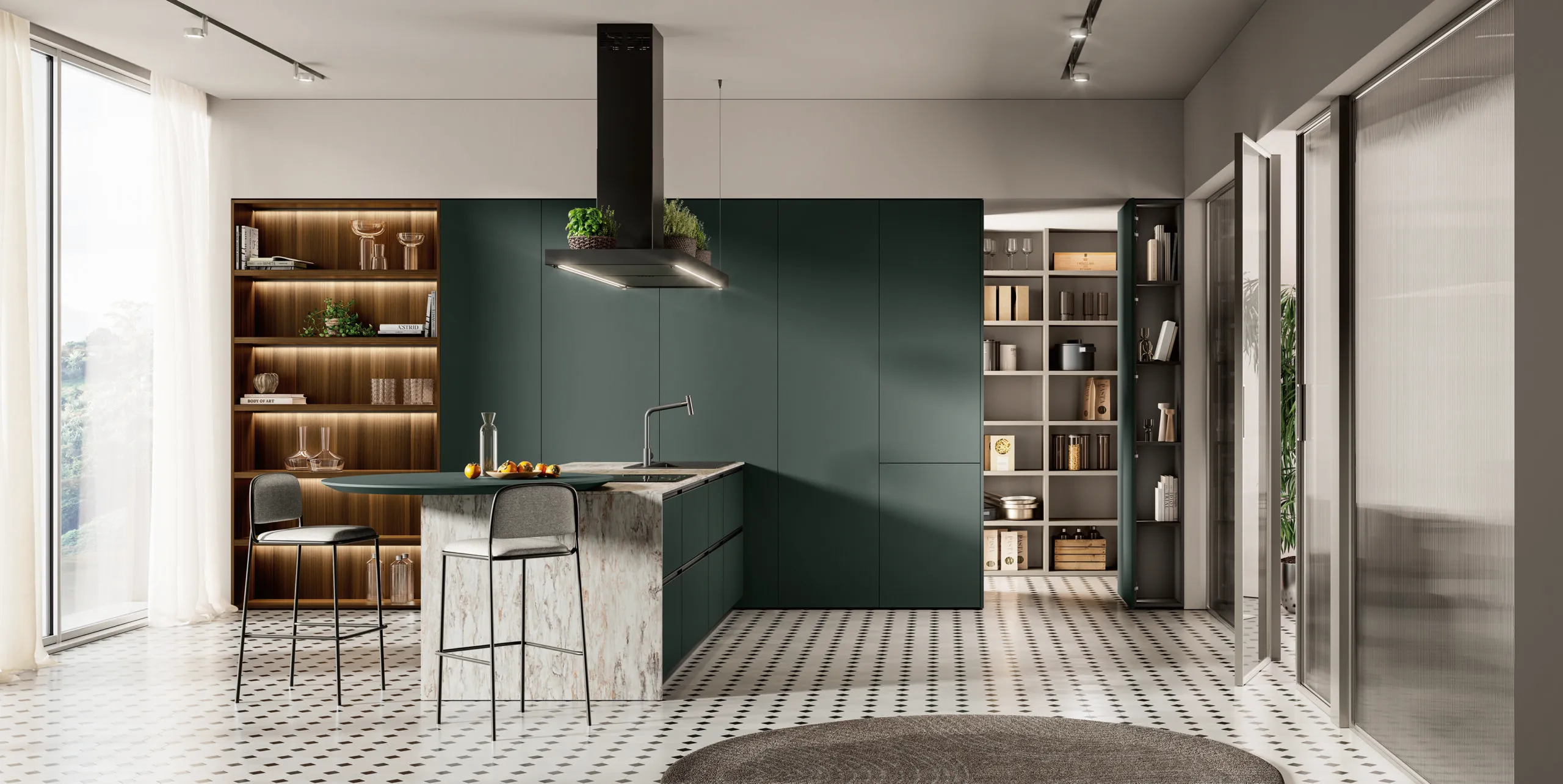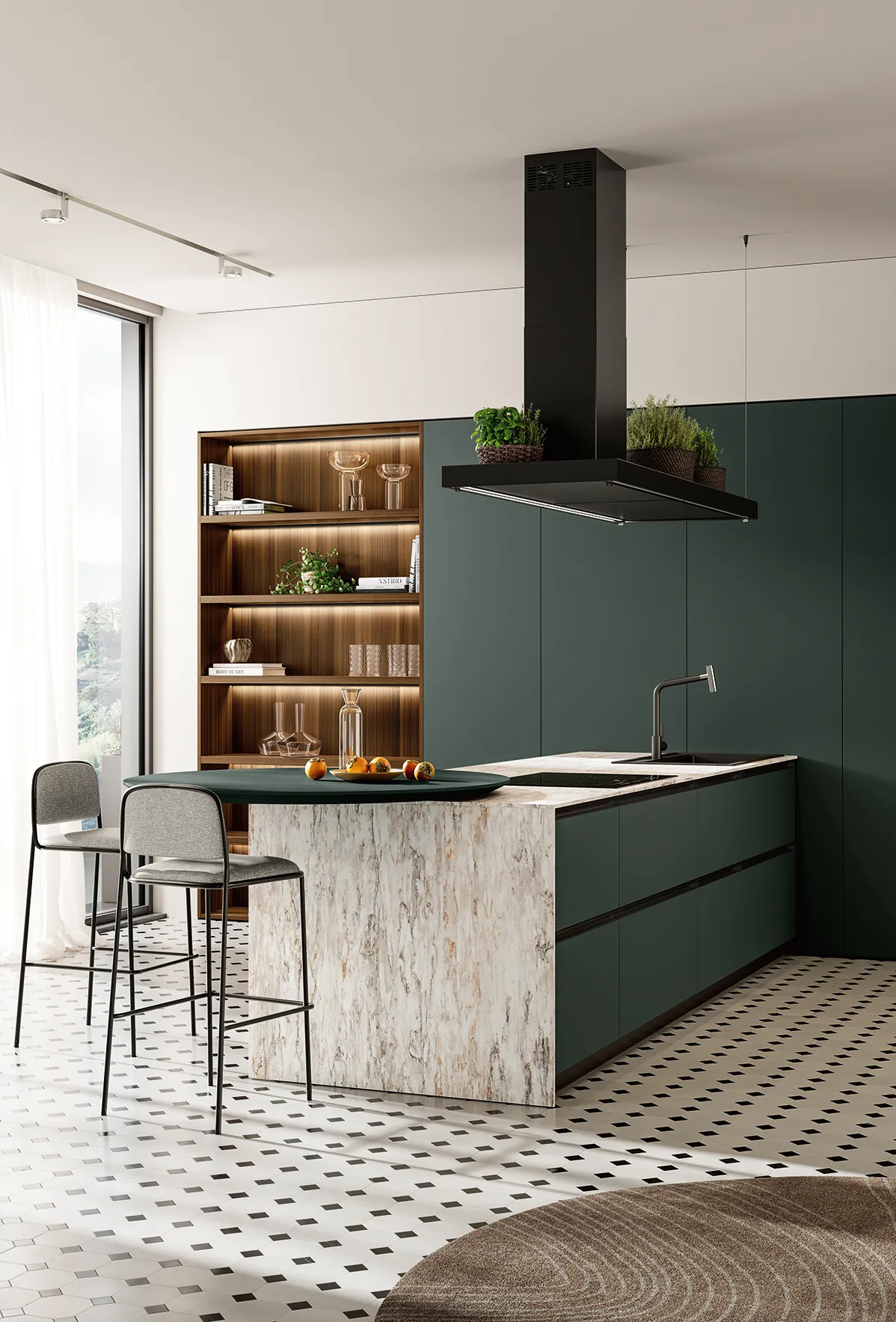 L'uniformità cromatica delle ante Green Alga in sintonia perfetta con il top Verde Comodoro, crea una cucina giovane ma estremamente raffinata.